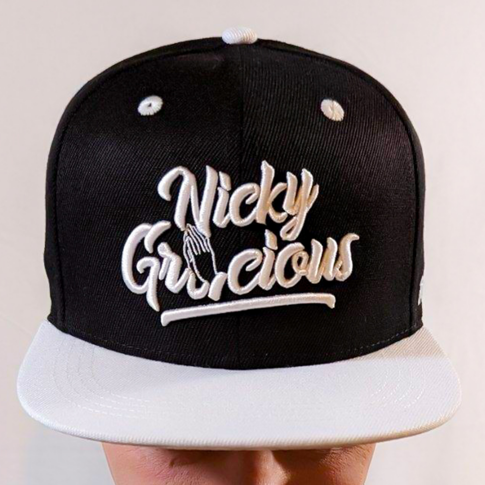 Introducing the Nicky Gracious black and white snap back! This stylish hat features Nicky's logo in bold white embroidery against a sleek black background. Made of high-quality materials, this snap back is both comfortable and durable. Perfect for showing your support for Nicky and his ministry while keeping your look fresh and trendy. Get your Nicky Gracious black and white snap back today!