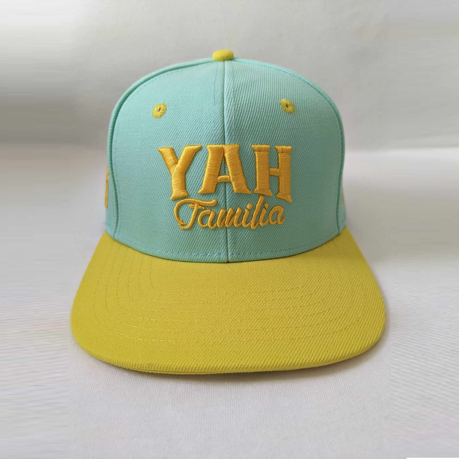 Introducing the Nicky Gracious teal and yellow snap back! This stylish hat features "Yah Familia" in bold yellow embroidery against a teal black background. Made of high-quality materials, this snap back is both comfortable and durable. Perfect for showing your support for Nicky and his ministry while keeping your look fresh and trendy. Get your Nicky Gracious teal and yellow snap back today!